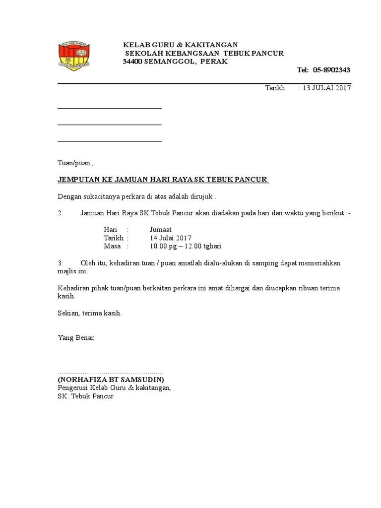 Contoh Surat Jemputan Sambutan Hari Raya Contoh Surat
